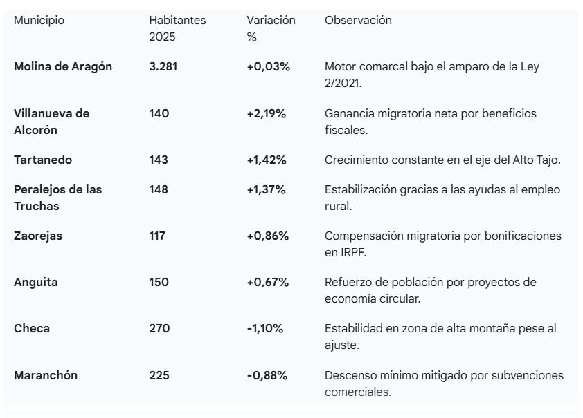 En la comarca de Molina-Alto Tajo, una de las áreas con menor densidad de población de Europa, las señales de estabilización demográfica han dejado de ser una percepción para convertirse en un dato estadístico. Según las Cifras oficiales de población resultantes de la revisión del Padrón municipal a 1 de enero de 2025 y el reciente Avance de la Estadística del Padrón Continuo, la zona muestra un avance contenido pero estratégico. Aunque el crecimiento es desigual, el análisis revela que la comarca ha logrado frenar su caída histórica gracias a un motor inesperado: la inmigración interior impulsada por incentivos fiscales.